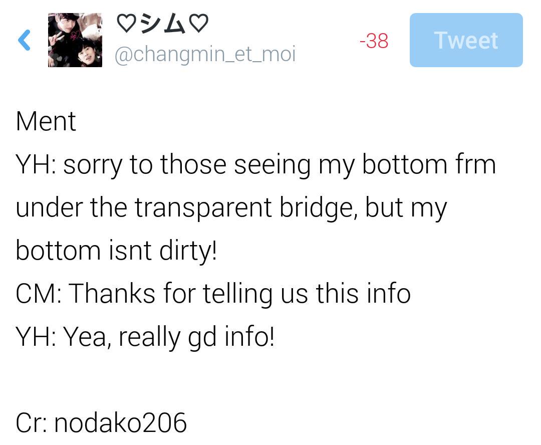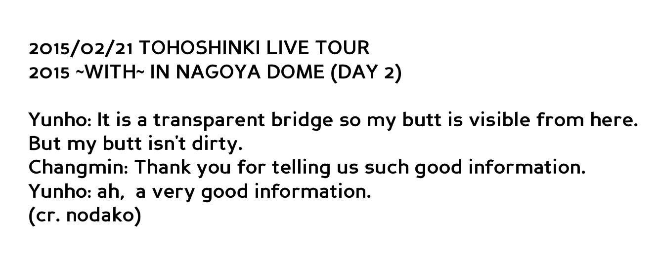 - Yunho: It’s a transparent bridge so my butt is visible from here But my butt isn’t dirty #TOHOWITHTOURINNAGOYA(Day 2)