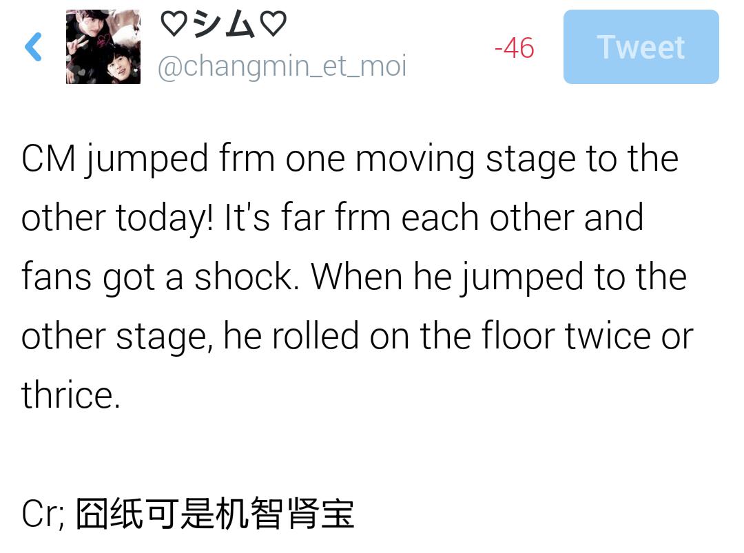 - Changmin scared everyone during STL when E moving stage had yet to join w the main stage. There was a gap. he jumped and landed in a roll!